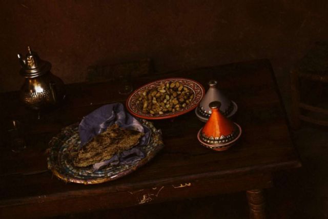 The Meal explora los detalles del espacio destinado a la preparación de un almuerzo corriente de una familia sahariana con estructuras rocosas y el color amarillo predominando en la oscuridad.