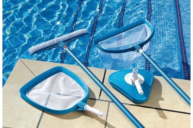 Recogehojas: es habitual que caigan hojas a diario en la piscina u otra suciedad que puede quedarse flotando en su agua. Para ello hay que recurrir a un recogehojas, que suelen tener una malla fina y un marco robusto para recoger la suciedad que se queda flotando en la piscina. Suelen tener un mango telescópico para facilitar la tarea de limpieza.