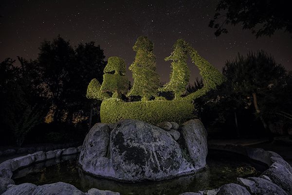 Escultura vegetal viva en El Bosque Encantado, iluminada en la noche.