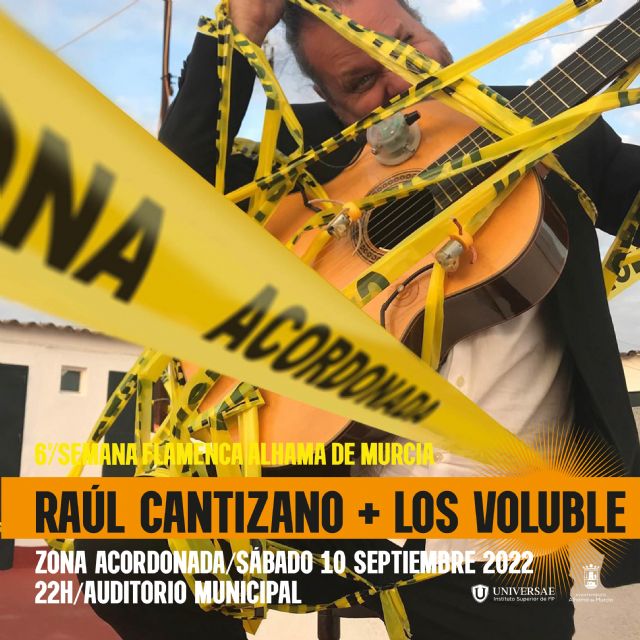 La Semana Flamenca de Alhama de Murcia tendrá como protagonistas en la noche del sábado a Raúl Cantizano y Los Voluble. A las 22h, el Auditorio Municipal Tierno Galván acogerá un espectáculo en el que se investiga un nuevo lenguaje escénico, visual y performático que amplía el espacio habitual del guitarrista más allá de la silla y sus dedos. Zona Acordonada es un recital atípico de guitarra expandida donde la luz, el video en directo y la acción acompaña a la música en un formato renovado y actual, viajando desde la concepción más clásica del instrumento a la más innovadora. Todo ello con el objetivo de desplazar los puntos de vista para llevar a cabo una reflexión sobre la sociedad, lo artístico y lo cultural. El espectáculo invita al espectador a pensar en la sociedad de control que con fenómenos como la pandemia de la Covid-19 nos ha llevado a un confinamiento inédito donde las pantallas y el control han roto tabúes.