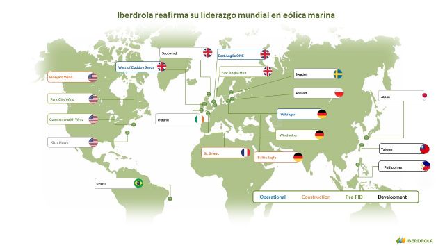 La cartera global de eólica marina de Iberdrola incluye un amplio abanico de proyectos en diferentes fases de desarrollo, en geografías como Reino Unido, Estados Unidos, Irlanda y Suecia, junto con una cartera de desarrollo en expansión en países como Japón, Taiwán, Filipinas y Corea del Sur.