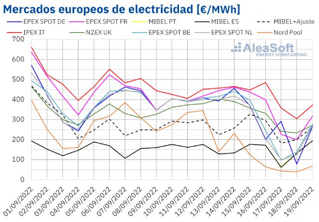En la tercera semana de septiembre, los precios de los mercados eléctricos europeos bajaron de forma generalizada, continuando la tendencia de las dos semanas anteriores. El descenso de los precios del gas volvió a ser una de las causas de estos descensos, a lo que esta vez se sumó el aumento de la producción eólica y la disminución de la demanda en la mayoría de mercados. Los días 16 y 17 se registraron horas con precios iguales o inferiores a 10,00 €/MWh, e incluso negativos, en algunos mercados
