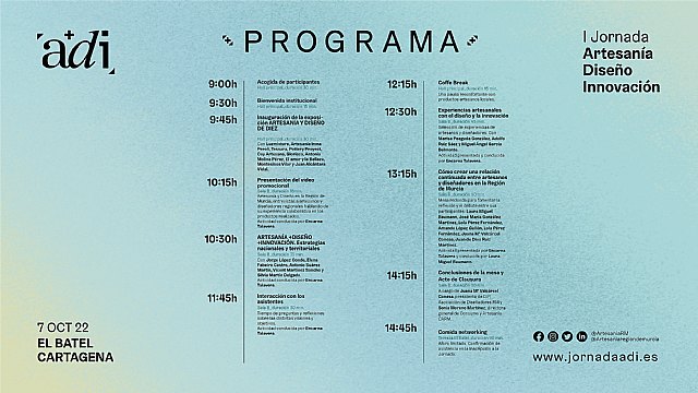 Desde dip, Asociación de Profesionales del Diseño y la Comunicación Publicitaria de la Región de Murcia y su grupo de trabajo de Artesanía, hemos organizado conjuntamente con la Dirección General de Artesanía un evento que no te puedes perder: I Jornada de artesanía + diseño + innovación = adi, en la Región de Murcia.
