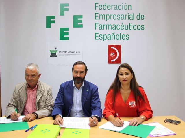 A la firma asisten el presidente de FEFE, Luis de Palacio, el presidente de UTF (Unión de Trabajadores de Farmacia), Gerardo Mosquera y Ana María Francés secretaria de Salud y Servicios Sociosanitarios y Dependencia de UGT Servicios Públicos.