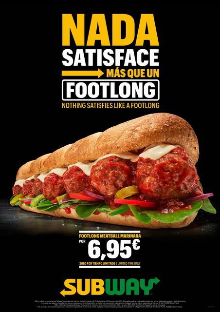 Un producto que no solo destaca por su tamaño, sino que además promete deleitar a todo tipo de clientes con su nuevo lema: Nada Satisface más que un Footlong. Y es que Meatball Marinara se convierte en una de las opciones ideales de Subway para disfrutar del mejor sabor, elaborado con vegetales frescos cortados a diario, una porción de queso con mucho sabor y, como protagonista, deliciosas albóndigas.
