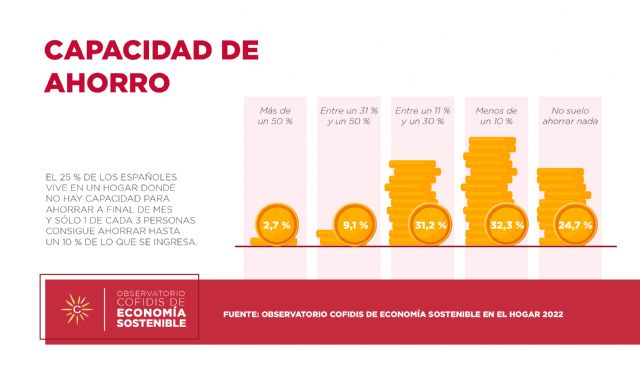 El 25% de los españoles vive en un hogar donde no hay capacidad para ahorrar a final de mes y sólo 1 de cada 3 personas consigue ahorrar hasta un 10% de lo que ingresa. Estos datos se desprenden del Observatorio Cofidis de Economía Sostenible en el Hogar 2022, un estudio realizado por la entidad financiera para analizar los nuevos modelos de vida en el siglo XXI, la capacidad de ahorro de la población española y su percepción ante el consumo sostenible, y también para ver cómo impactan en las respectivas economías domésticas los proyectos personales de futuro de los españoles, entre otros temas de análisis.