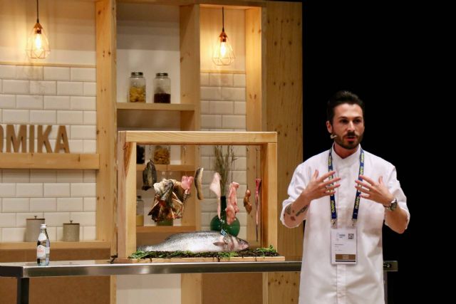 Solo los más grandes chefs del mundo que han tenido la suerte de subirse a ese escenario saben lo que imponen las tablas del Kursaal Donostia. Ver en primera fila a las máximas figuras de la cocina vasca, de todo el país y del mundo, a los críticos y periodistas gastronómicos más conocidos del planeta y cientos de cocineros llegados de todas las latitudes, no se olvida nunca. Eso es lo que vio Samuel Naveira durante 30 minutos de ponencia donde llevó a todos los presentes a su entorno de El Bierzo, a sus sabores y aromas más profundos, con un discurso de sostenibilidad, defendiendo la acuicultura responsable con el medio ambiente, el respeto animal sin sufrimiento y la calidad del producto. Con su diálogo claro demostró como un cocinero de interior debe mirar al mar con responsabilidad y criterio, para ello utilizó la lubina atlántica Aquanaria como conductora de sus platos, como protagonista de lo que supone el máximo aprovechamiento en la alta cocina.