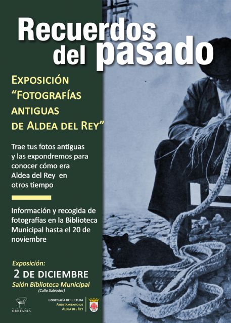 Desde su Concejalía invitan a todos los vecinos a colaborar con sus propias fotografías antiguas y que recogen esos momentos irrepetibles de la vida del municipio. Así, una vez plasmados en un libro, podrán pasarse de generación en generación, para que las futuras generaciones conozcan de primera mano sus orígenes y la evolución de Aldea del Rey. Todas las fotografías se recogerán en formato original, en la Biblioteca Municipal, en horario de atención al público, de 9 a 14 h y de 16 a 18 h, hasta el día 20 de noviembre —las fotografías serán devueltas a sus propietari@s—.