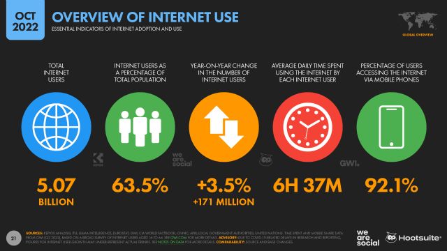 Según el informe, los usuarios de Internet han aumentado un 3,5% desde octubre de 2021, alcanzando los 5.070 millones al entrar en el último trimestre del año. Más del 63% de la población mundial usa Internet, con 171 millones de nuevos usuarios en los últimos 12 meses. Además, pasan un total diario de 6 horas y 37 minutos navegando por la Red, 20 minutos menos que el año pasado.