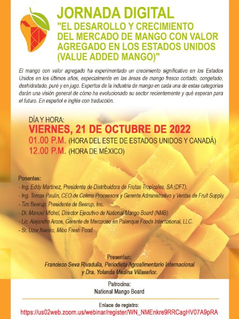 La National Mango Board organiza el próximo viernes 21 de octubre la Jornada Digital "El Desarrollo y Crecimiento del Mercado de Mango con Valor Agregado en los Estados Unidos, que se realizará a través de Zoom de forma gratuita, a la una de la tarde (hora del este de Estados Unidos y Canadá). Este evento se realizará en español pero con traducción al inglés.