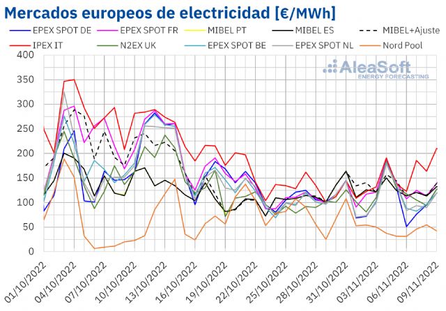 Como resultado, en el período del 7 al 9 de noviembre, el precio promedio más bajo fue el del mercado nórdico, de 47,62€/MWh. Los promedios de los mercados alemán y belga también fueron inferiores a 100€/MWh, concretamente de 99,32€/MWh y 99,45€/MWh respectivamente. En cambio, el promedio más alto, de 186,50€/MWh, fue el del mercado italiano, seguido por el precio del mercado francés, de 125,92€/MWh.