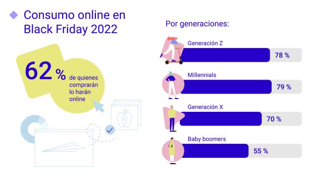 Si analizamos el consumo por edades, vemos cómo esta tendencia aumenta de forma sustancial entre las generaciones más jóvenes. El 79 % de los y las millennials y el 78 % de los y las integrantes de la generación Z que comprarán en este momento del año realizará sus adquisiciones en el canal online. A medida que avanza la edad, la predilección por las transacciones electrónicas disminuye.