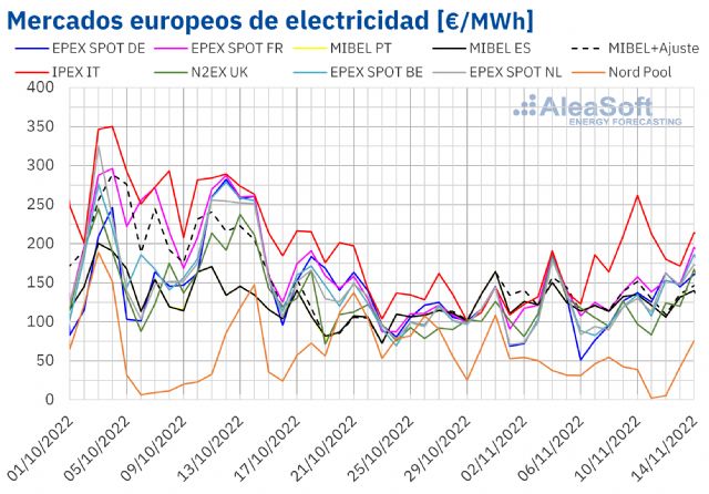 En la segunda semana de noviembre, el promedio de precios de mercado más elevado, de 197,95 €/MWh, fue el del mercado italiano. Por otra parte, el menor promedio semanal fue el del mercado nórdico, de 32,96 €/MWh. En el resto de los mercados, los precios se situaron entre los 107,23 €/MWh del mercado británico y los 139,29 €/MWh del mercado francés.