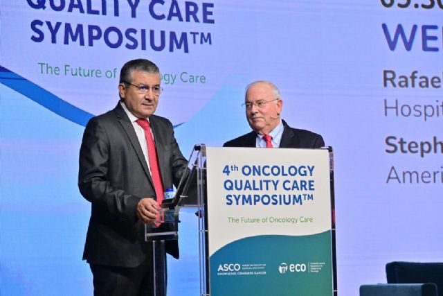 Pie de foto: El Dr. Rafael López, presidente de la Fundación ECO, inaugura la jornada junto a Stephen Grubbs, vicepresidente de Asuntos Clínicos de ASCO.