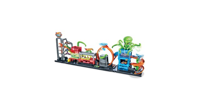 El Autolavado ataque extremo de Hot Wheels™ City está repleto de características impresionantes en más de 1 metro de largo e incluye un coche que ofrece múltiples sorpresas que harán que los niños quieran jugar una y otra vez. Nada más sacarlo de la caja, el vehículo Color Reveal™ está cubierto con una capa verde para dar comienzo a la aventura. Llena el primer depósito con agua, deja caer el coche en él y muévelo para la primera sorpresa: ¡un vehículo Hot Wheels® con una decoración alucinante! Recorre con el coche la pista —que incluye un looping— y deja que el exceso de agua se escurra mientras admiras los impresionantes detalles del coche. ¡Antes del lavado final, llena la cabeza del pulpo con agua fría y rocía el coche a través de los tentáculos para revelar otra decoración totalmente diferente! Para devolverlo a su color original, usa agua templada. ¡Pasa con el coche a través del autolavado y repite una y otra vez para verlo cambiar entre los dos últimos cambios de color! A los niños les encantará la acción y la transformación. A los padres les encantará la capacidad de plegarla a la mitad para un almacenamiento compacto. Los colores y la decoración pueden ser distintos de los mostrados.