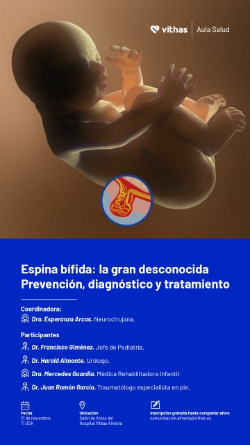 Vithas Almería organiza un Aula de Salud con motivo del Día Internacional de la Espina Bífida que se celebrará el próximo 21 de noviembre a las 17:30h en el salón de actos del hospital almeriense. La sesión se desarrolla coincidiendo con la efeméride de ese día y tiene como fin promover la prevención, diagnóstico y tratamiento de la enfermedad desde un punto de vista científico, divulgador y personal. Este Aula Salud forma parte de la iniciativa de Vithas de formar e informar a la sociedad sobre aspectos relacionados con el cuidado de la salud.