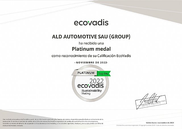 ALD Automotive España ha recibido, por tercer año consecutivo, la certificación de ECOVADIS en la máxima PLATINUM por su labor en responsabilidad social corporativa. Se trata de un reconocimiento internacional al trabajo y compromiso de la compañía de renting en materia de RSC y sostenibilidad que evalúa una amplia gama de sistemas de gestión no financieros que abarca aspectos como el impacto en el medio ambiente, las prácticas laborales y derechos humanos, la ética y las compras sostenibles.