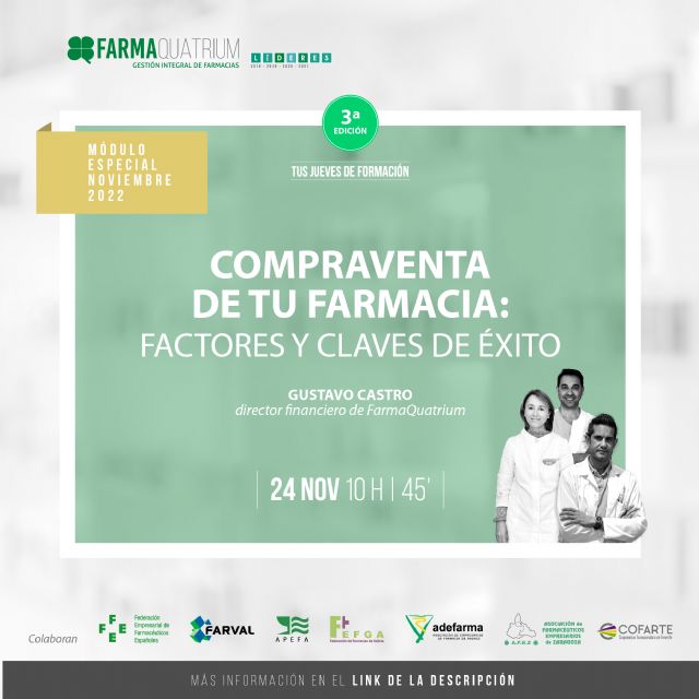 · El director financiero de FarmaQuatrium, Gustavo Castro, analizará, el próximo jueves 24, en la última sesión del Módulo Especial de Noviembre de "Tus Jueves de Formación", los factores determinantes para lograr que la compraventa de una botica sea viable y tenga un futuro prometedor