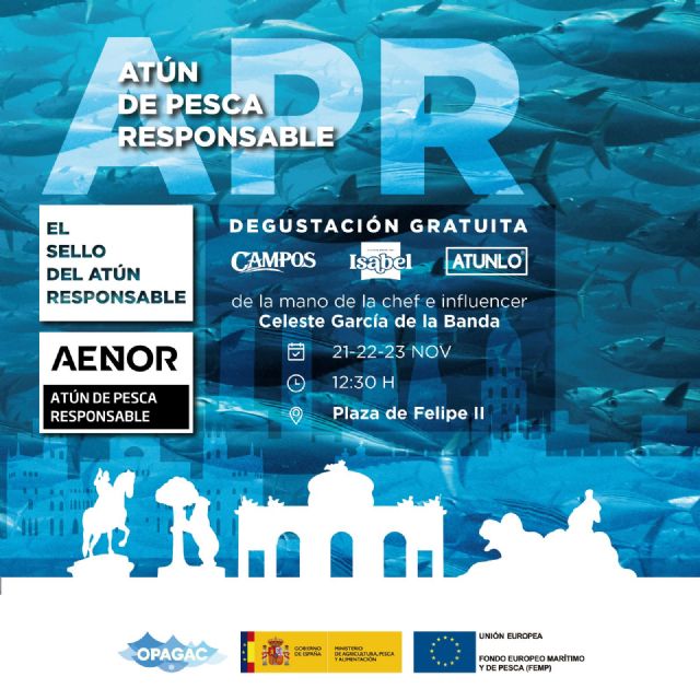 Los próximos 21, 22 y 23 de noviembre el mar llegará a Madrid de la mano de Atún de Pesca Responsable (AENOR APR), el sello que certifica que el atún se ha pescado garantizando los derechos sociales y laborales de la flota atunera y cumpliendo con las mejores prácticas pesqueras. Esta acción está organizada por la Organización de Productores Asociados de Grandes Atuneros Congeladores (OPAGAC), con la financiación del Ministerio de Agricultura, Pesca y Alimentación y el Fondo Europeo Marítimo y de la Pesca. Además, cuenta también con la colaboración de Isabel, Conservas Campos y Atunlo, marcas adheridas a la certificación.