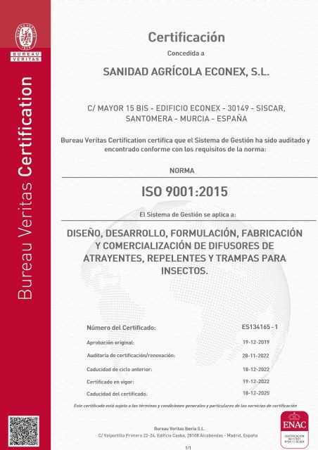 SANIDAD AGRÍCOLA ECONEX S.L. ha superado con éxito las auditorías de BUREAU VERITAS para renovar su certificación de su Sistema de Gestión de Calidad conforme a los requisitos de la norma UNE-EN ISO 9001:2015. Este reconocimiento acredita la madurez y la eficacia del Sistema de Gestión de Calidad en las distintas áreas de la empresa de I+D+i: diseño, desarrollo, formulación, fabricación y comercialización de difusores de atrayentes, repelentes y trampas para insectos.