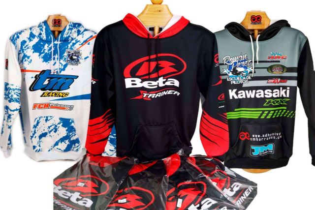 Uno de los productos estrellas del último tiempo de ADHESIVOSEMBARRADOS son las sudaderas personalizadas. No solo se utilizan para ir por carreteras sino también en entrenos. Hoy en día, es habitual observar grupos de pilotos que se desplazan juntos y lucen los mismos colores corporativos o los mismos logos de empresas patrocinadores. En este camino, ADHESIVOSEMBARRADOS ofrece este artículo con capucha, con cuello redondo, o con cremallera al estilo chaqueta. A pesar de que cuenta con modelos prediseñados, los clientes pueden solicitar diseños desde cero. En tanto, pueden estar adaptadas para motocross o enduro.