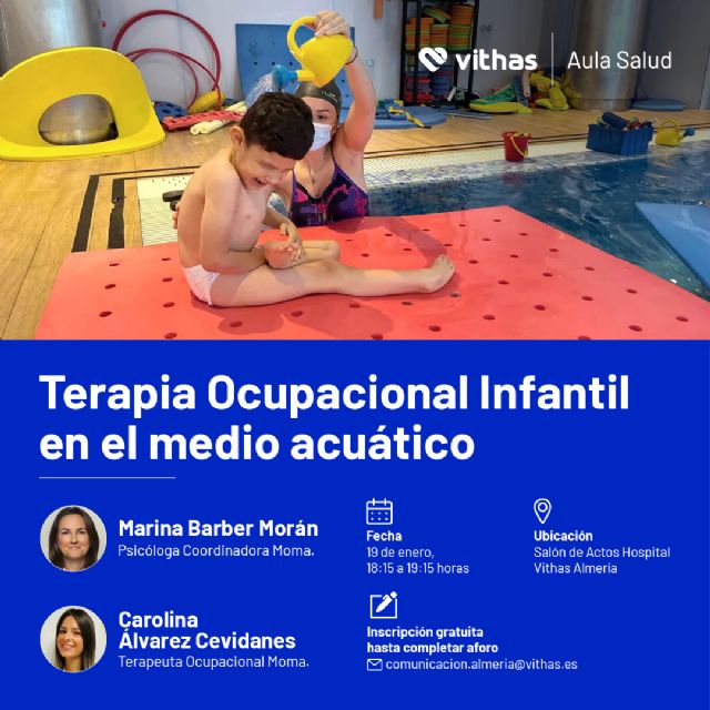 "El Hospital Vithas Almería, a través de su unidad Espacio Terapéutico MOMA, promueve este Aula Salud que permite ofrecer a familias y profesionales profundizar en los beneficios que aporta la terapia ocupacional en determinadas patologías y/o retrasos en el desarrollo, así como, en conocer una actividad que desarrollamos en Vithas Almería, que es la terapia ocupacional acuática", confirma la coordinadora de MOMA, Marina Barber.