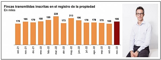 El director de Estudios destaca que “se confirma la tendencia al alza por 21º mes consecutivo, a la espera que los valores negativos previstos lleguen más pronto que tarde. Si analizamos los datos teniendo en cuenta lo sucedido durante un año natural, ya se superan las 650.000 compras de vivienda, lo que nos deja en cifras parecidas a la pasada burbuja inmobiliaria”. “La obra nueva, que representa un 18% del total de la actividad, vuelve a mostrar síntomas de desaceleración y retrocede respecto al año pasado por tercer mes consecutivo, en este caso un -3%. Por el contrario, la vivienda de segunda mano mantiene la actividad al alza, creciendo con valores de dos cifras por 21º mes consecutivo”.