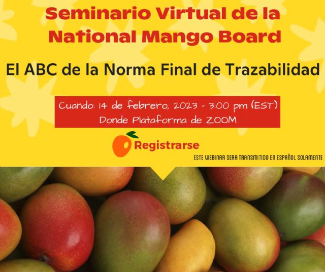 National Mango Board llevará a cabo el próximo 14 de febrero el seminario virtual denominado "El ABC de la Norma Final de Trazabilidad". Este seminario tendrá una duración de 1 hora y los participantes tendrán la oportunidad de hacer preguntas al final de la ponencia. Este webinar será retransmitido en español, y con traducción simultánea inglés, a través de Zoom, a las 3.00 p.m. (horario del Este Estados Unidos), y es gratuito.