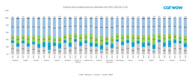 En el caso de los modelos eléctricos, es Baleares la comunidad que más interés mostró el pasado año por este tipo de carburante. Según datos de carwow, el 20% de los usuarios de Baleares configuró al menos un modelo eléctrico en 2022. También se trata de la región con mayor variación con respecto al año 2021, con un incremento del 42% (pasando del 14% al 20%).