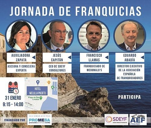 La ciudad de Melilla acogerá una Jornada de Franquicias el próximo martes 31 de enero, que está organizada por SDEYF Consultores, patrocinada por Proyecto Melilla SA (PROMESA) y cuenta con la colaboración de la Asociación Española de Franquiciadores (AEF). Un evento que se va a celebrar en el Hotel Melilla Puerto, de 9:15 a 14:00 horas.