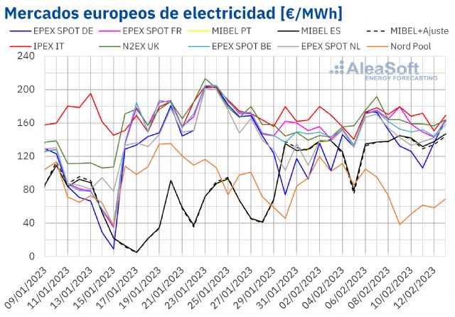 Por lo que respecta a los precios diarios, el lunes 13 de febrero se alcanzó un precio de 146,77 €/MWh en el mercado MIBEL de España y Portugal. Este precio fue el más alto desde el 6 diciembre de 2022 en este mercado.
