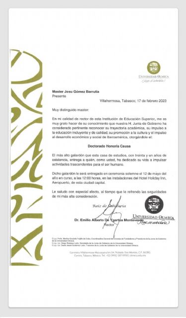 La Universidad Olmeca de México otorga el Doctor Honoris Causa por su impulso al desarrollo emprendedor en Iberoamérica al empresario y consultor Josu Gómez Barrutia.