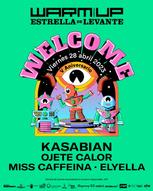 WARM UP Estrella de Levante cierra hoy el cartel de la Welcome V Aniversario, que tendrá lugar el viernes 28 de abril en La Fica (Murcia) con una gran sorpresa internacional: Kasabian. La banda británica se une a los ya confirmados para el quinto aniversario del festival murciano: Ojete Calor, Miss Caffeina y ELYELLA que actuarán en el Escenario Estrella de Levante.