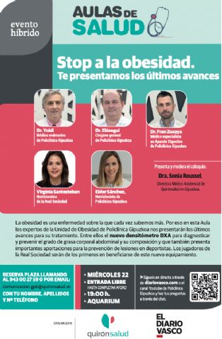 Para ofrecer información y los últimos avances al respecto, en el Aula de Salud se abordará esta enfermedad desde una perspectiva médica, de la mano de un equipo multidisciplinar integrado por el médico endocrino Dr. Alfredo Yoldi; el especialista en aparato digestivo, Dr. Fran Zozaya; el cirujano general, Dr. José Luís Elósegui y la nutricionista, Eider Sánchez.