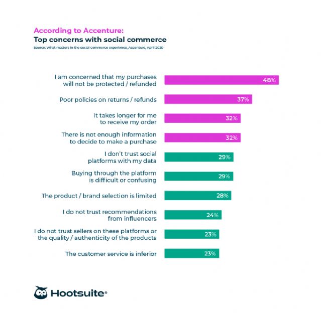 Asimismo, los consumidores afirman que el mayor obstáculo para comprar a través de las redes sociales es la falta de confianza tanto en las redes sociales como en los vendedores. Según una encuesta de Accenture realizada a más de 10.000 consumidores, las tres principales preocupaciones de los compradores en redes sociales se deben a la falta de confianza en los vendedores. Lo que más les preocupa es que sus compras no estén protegidas o que no se les reembolse el dinero. También les preocupa la calidad y autenticidad de los productos y de las marcas. Y la tercera preocupación más común surge de la confianza en las propias redes sociales, ya que los usuarios afirman que no quieren compartir sus datos bancarios con ellas.