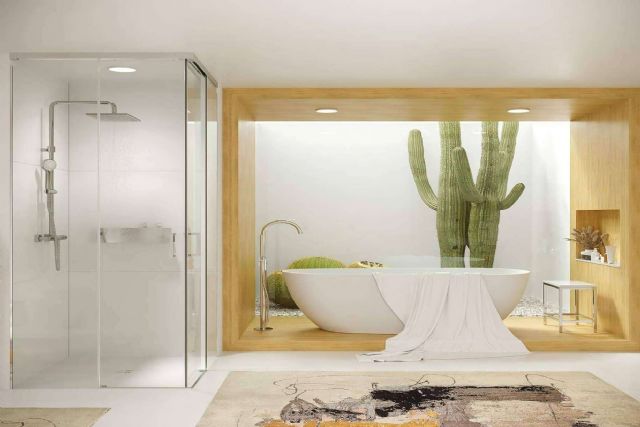 El equipo de Varobath se refiere al aprovechamiento de la luz del sol o el uso de colores y texturas naturales en el interior del baño. Las mamparas de ducha a techo permiten también apreciar desde cualquier punto del baño los detalles de la grifería, la iluminación artificial, el mobiliario y piezas sanitarias.