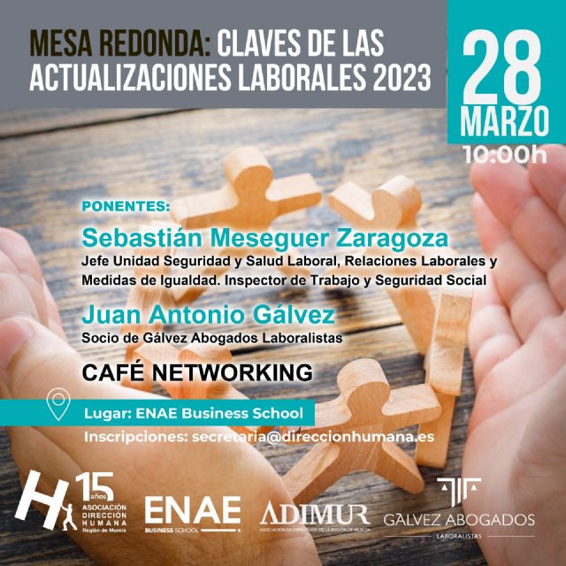 Un encuentro que se celebrará el próximo martes 28 de marzo, a las 10 horas, en ENAE Business School, y que contará con la participación de Sebastián Meseguer Zaragoza, jefe de la Unidad Seguridad y Salud Laboral, Relaciones Laborales y Medidas de Igualdad de la Inspección de Trabajo de Murcia; y Juan Antonio Gálvez, socio de Gálvez Abogados Laboralistas.