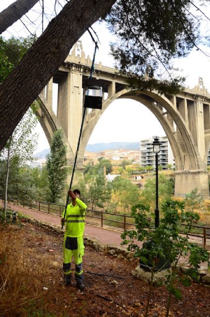 Además, el personal técnico de Lokímica también instala en el arbolado trampas de feromonas para capturar a la procesionaria. Se trata de un método muy eficaz que consiste en la colocación de trampas con una feromona sintética como cebo. La finalidad es capturar el mayor número de machos en su fase de mariposa, que se sienten atraídos, y caen en la bolsa de recolección, donde quedan atrapados sin poder salir. El trampeo reduce la probabilidad de encuentro entre machos y hembras, lo que se traduce en una reducción muy significativa del número de hembras fecundadas. En este caso, es fundamental realizar el trampeo masivo todos los años sin interrupción para lograr mantener a la población en niveles bajos.