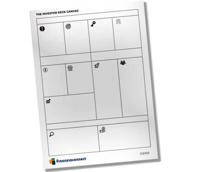 Para complementar al Investor Deck, documento de gran importancia para abrir la puerta de los inversores de startups, Finanziaconnect, empresa especializada en la obtención de préstamos Enisa y otras líneas de financiación, ha creado el Investor Deck Canvas, una herramienta gratuita que ayuda a la elaboración de este documento y que atiende a los requerimientos de los inversores del ecosistema emprendedor. Asimismo, tiene una doble finalidad porque sirve para anotar las ideas que deben estar incluidas en cada slide y también se utiliza de check list de autoevaluación para asegurarse del contenido de cada capítulo del deck.