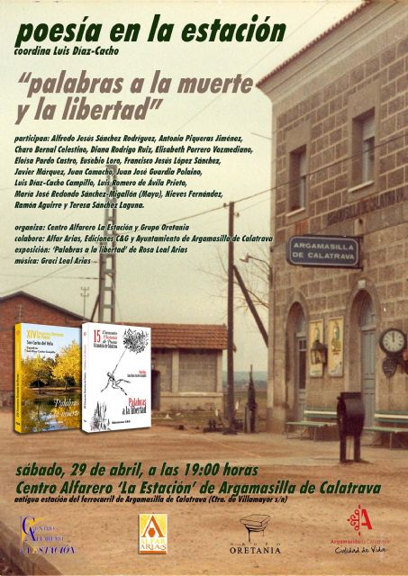 El próximo 29 de abril, a las 19,00 horas, en el Centro Alfarero La Estación de Argamasilla de Calatrava, tendrá lugar el recital "Poesía en la Estación: Palabras a la muerte y la libertad", coordinado por el poeta Luis Díaz-Cacho, cuenta con la participación de los poetas Alfredo Jesús Sánchez Rodríguez, Antonia Piqueras Jiménez, Charo Bernal Celestino, Diana Rodrigo Ruiz, Elisabeth Porrero Vozmediano, Eloísa Pardo Castro, Eusebio Loro, Francisco Jesús López Sánchez, Javier Márquez, Juan Camacho, Juan José Guardia Polaino, Luis Díaz-Cacho Campillo, Luis Romero de Ávila Prieto, María José Redondo Sánchez-Migallón (Mayu), Nieves Fernández, Ramón Aguirre y Teresa Sánchez Laguna. El acto está organizado por el Centro Alfarero La Estación y el Grupo Oretania, en el que colaboran el Excmo. Ayuntamiento de Argamasilla de Calatrava y el Alfar Arias de Puertollano. El apartado musical está a cargo de la alfarera Graci Leal Arias.