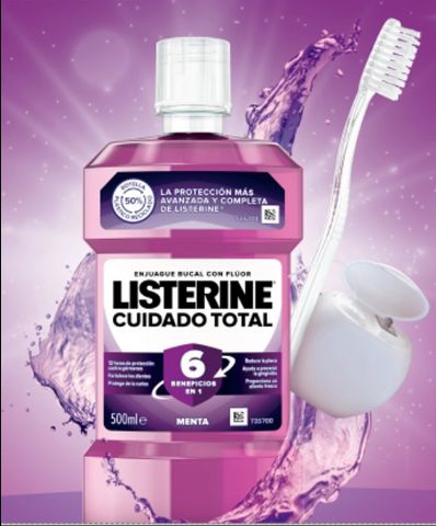 LISTERINE® Cuidado Total ofrece 6 beneficios en 1, para una salud bucal completa y ha demostrado ser 5 veces más eficaz reduciendo la placa que el cepillo y el hilo dental solos.
