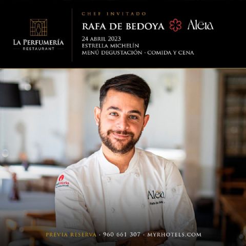 Rafa De Bedoya ofrecerá servicio de comida y cena el lunes 24 de abril con plazas limitadas (es imprescindible reservar previamente llamando al 960 661 307 o mediante la web de MYR Hotels). El menú maridado tendrá un precio de 120 euros y constará de: