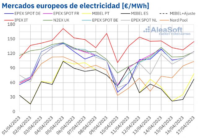 Durante la semana del 10 de abril, el descenso del precio promedio del gas y de los derechos de emisión de CO2 propició la caída de los precios de los mercados europeos. También contribuyó a este comportamiento el incremento generalizado de la producción eólica respecto a la semana anterior y el descenso de la demanda en la mayoría de mercados. En el mercado MIBEL, los precios cero estuvieron favorecidos también por la alta producción solar registrada en un período de menor demanda eléctrica como es el fin de semana, en el que además las temperaturas fueron suaves.