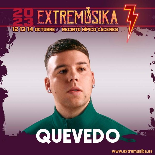 QUEVEDO actuará en EXTREMÚSIKA haciendo que el festival sea punto de partida de grandes eventos y que Cáceres se posicione entre las ciudades musicales de España. QUEVEDO está “donde quiere estar” y él mas que nadie lo sabe, su legión de fans lo han convertido en un pelotazo de éxito y él lo agradece cantando sus canciones que llegan a todos los corazones del mundo.