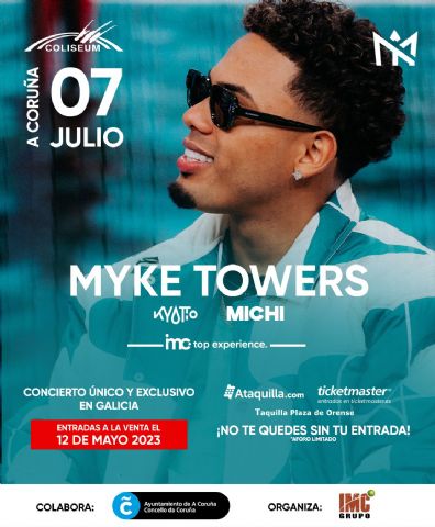 El único concierto que Myke Towers ofrecerá en Galicia, se encuentra dentro del IMC Top Experience, un gran evento de ocio que no dejará indiferente a nadie, y que será una estupenda oportunidad para que todos sus seguidores, y los amantes de la música urbana, puedan disfrutar de su concierto en vivo. El Coliseum de A Coruña será el escenario de este espectáculo el próximo 7 de julio y las entradas estarán disponibles en Ataquilla y Ticketmaster a partir del 12 de mayo.