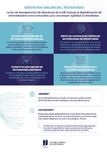 Por primera vez en la historia los notarios podrán prestar servicios online si así lo quieren ciudadanos o empresas, gracias a la aprobación de la Ley de transposición de directivas de la UE, que incluye la digitalización de actuaciones notariales.