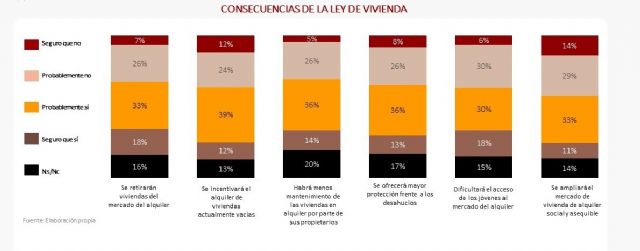0En relación a cómo afectará la nueva normativa al mercado inmobiliario existe una gran división de opiniones. En concreto, los murcianos creen que lo más posible es que una de las principales consecuencias de la Ley sea la retirada de viviendas del mercado de alquiler (53%) y, por el contrario, lo menos probable es que se amplíe el mercado de vivienda de alquiler social y asequible (42%).