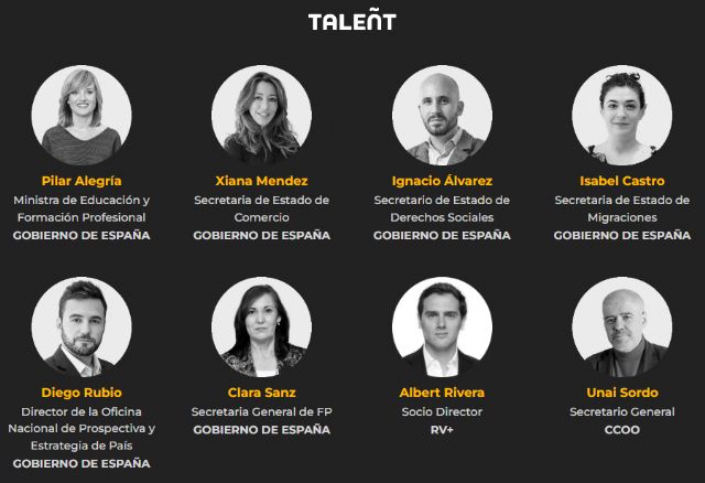 Figuras políticas: Pilar Alegría, ministra de Educación y Formación Profesional; Albert Rivera expresidente de Ciudadanos y socio director de RV+; Xiana Mendez, secretaria de Estado de Comercio; Ignacio Álvarez, secretario de Estado de Derechos Sociales; Isabel Castro, secretaria de Estado de Migraciones; Diego Rubio, director de la Oficina Nacional de Prospectiva y Estrategia de País y Clara Sanz, secretaria general de Formación Profesional.