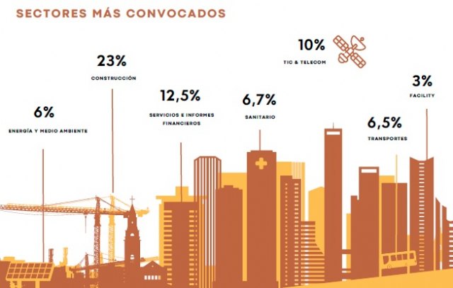 Analizando los sectores empresariales que aglutinan más concursos públicos, destacan en primer lugar las licitaciones para la construcción de viviendas, con un 23%; seguida de los concursos de servicios e informes financieros (un 12,5% del total), y los destinados a las tecnologías de información y cominucación (TIC), con un 10%.