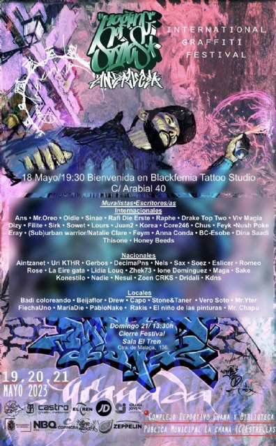 Del 18 al 21 de mayo Granada recibirá a referentes internacionales y nacionales de este arte como Filite, Vic Magia, Ala Crew, Romeo y Aintzanet, entre muchos otr@s que compartirán múltiples actividades de graffiti, pintura mural, exposiciones, música, juegos y breakdance .